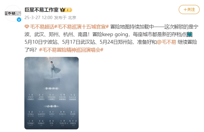3月27日,@巨星不易工作室 官宣毛不易演唱会宁波、武汉、郑州、杭州、南昌站。