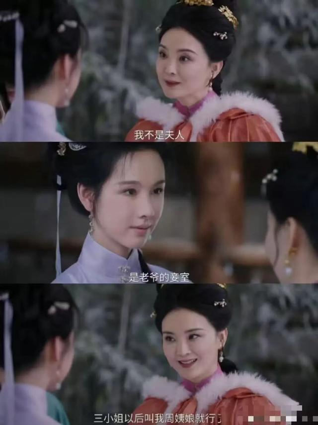 弹幕飘过一阵赞美之词,“还得是老演员,一出场感觉都不一样”,“这周姨娘好可爱啊”,“一股红楼梦王熙凤的味道”,“还是熟悉的声音,好亲切”。