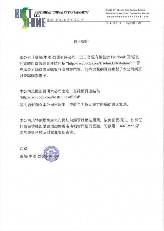 声明表示,这几天有骗子用复制了本公司信息的虚假网页冒充公司,骗市民购买各演唱会的门票,就此公司已报案,并将全力协助警方将骗子绳之于法。