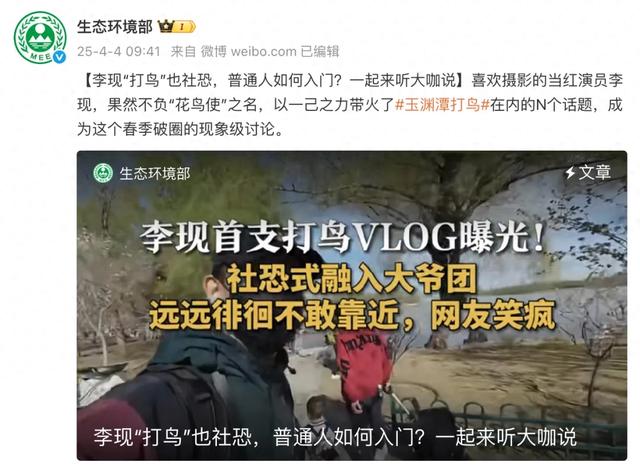 4月4日,@生态环境部 发文称,喜欢摄影的当红演员李现,果然不负“花鸟使”之名,以一己之力带火了#玉渊潭打鸟#在内的N个话题,成为这个春季破圈的现象级讨论。全国各地文旅部门闻风而动,纷纷在官方社交媒体平台上“喊话”李现,邀请他来自己的城市“打鸟”。
