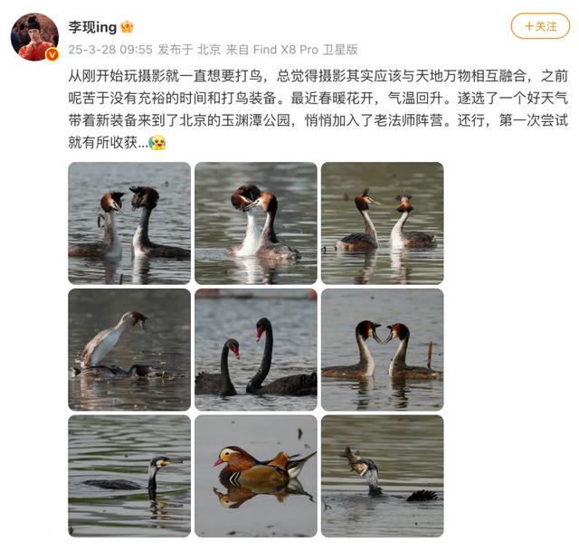 3月以来,有多位网友在北京玉渊潭公园偶遇李现背着专业摄影设备,穿梭于大爷摄影团之间。虽然他包裹严实,但还是被网友们认了出来。话题#李现加入公园打鸟大爷队伍#一度冲上热搜,引发网友关注。
