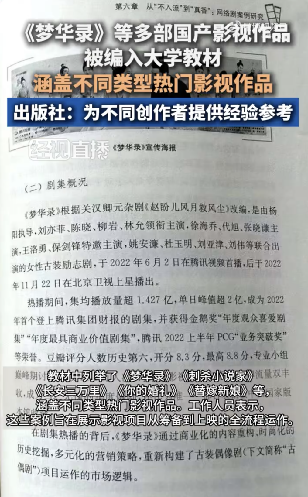 另据经视直播消息,该社出版的《影视项目运作案例研究》教材于今年2月面世,适用于高校本科和高职教学,自媒体从业者也能从中受益。