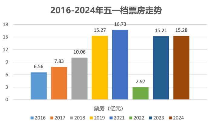 例如在2019年,在五一档前一周上映的漫威电影《复仇者联盟4》,力压档期其他影片,以12.22亿的档期票房,拿下五一档冠军,并基于五一假期首次调整至4天的时长优势,将五一档的大盘票房拉至15亿以上。后来,五一假期进一步拉长至5天,而档期票仓规模基本在15亿的维度稳定下来。