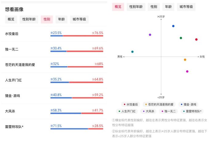 猫眼专业版数据显示,五一档的真人电影中,虽然多数影片仍然延续了女性受众为主的大盘整体走势,但悬疑片《大风杀》、漫威电影《雷霆特攻队》,都呈现出了更为明显的男性向,男性想看人群占比分别达到58.3%和71.5%。而在年龄分布上,影片对应受众的差异化也比较明显。比如同为女性向的《水饺皇后》和治愈家庭片《独一无二》,前者25岁以上的女性观众占比接近50%,而后者则多为25岁以下的女性受众,占比为41.8%。