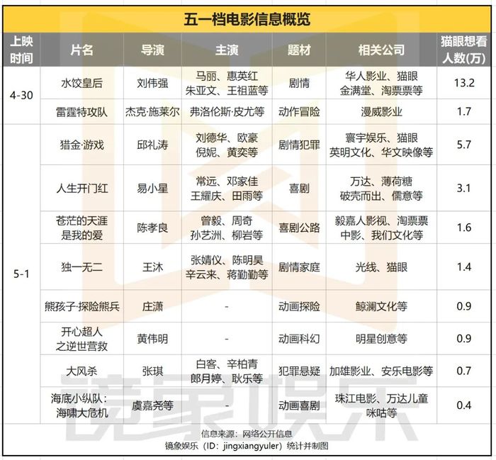 目前来看,基于当前的影片阵容和市场关注度,今年五一档的票房冠军大概率会从这两部影片中走出,这也在很大程度上体现出今年五一档求“稳”的调性。