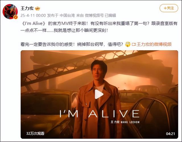 此前,4月11日0时,王力宏发布MV,配文:《I’m Alive》 的官方MV终于来啦!有没有听出来我重唱了第一句?跟录音室版有一点点不一样……我就是想让那个瞬间更深刻!看完一定要告诉我你的感受!烧掉那台钢琴,值得吧?