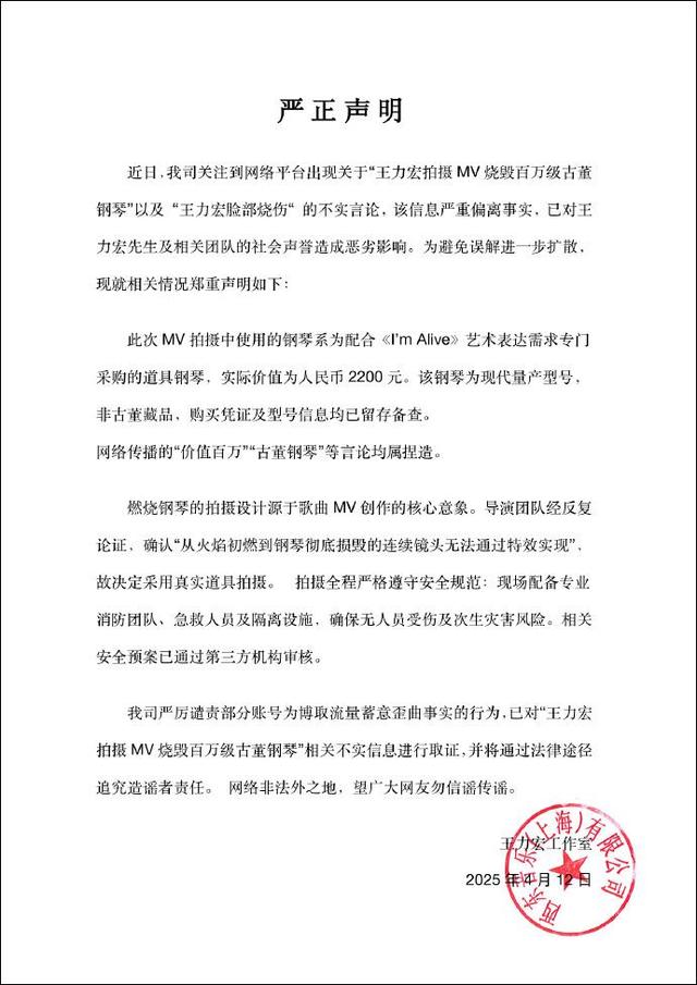 近日,我司关注到网络平台出现关于“王力宏拍摄MV烧毁百万级古董钢琴”以及“王力宏脸部烧伤”的不实言论,该信息严重偏离事实,已对王力宏先生及相关团队的社会声誉造成恶劣影响。为避免误解进一步扩散,现就相关情况郑重声明如下: