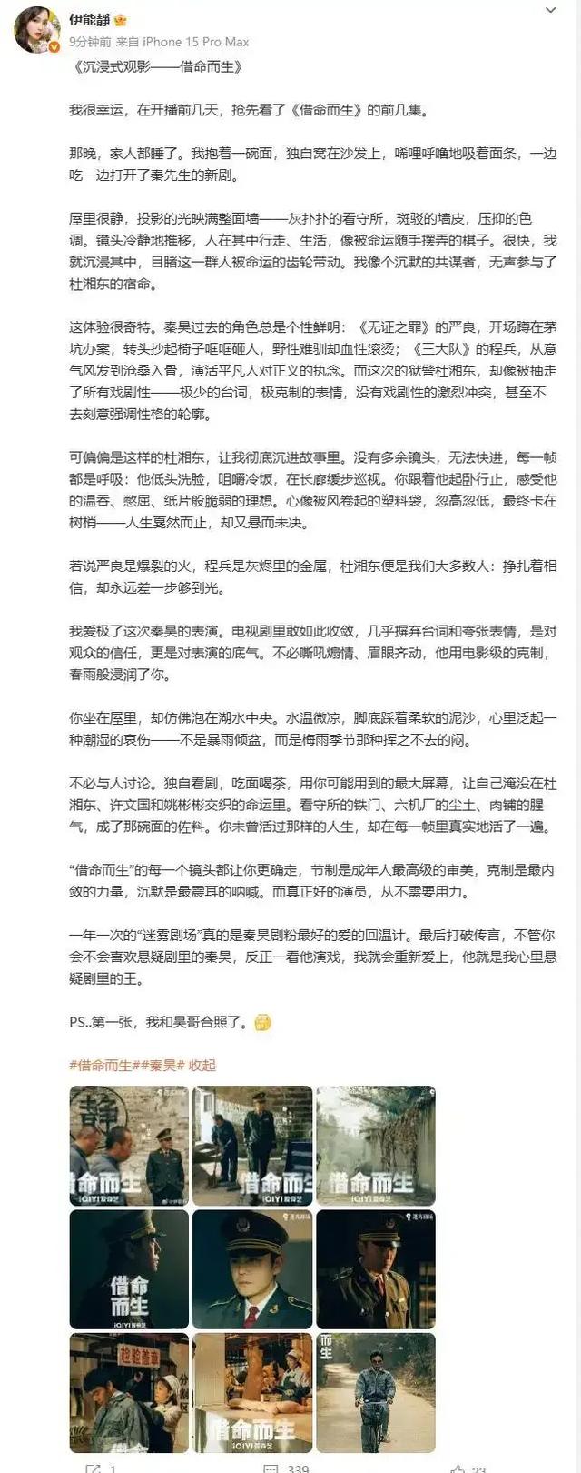 不得不说,伊能静依然很会写,也真正懂得秦昊演技的好,尤其是其克制型的电影化表演风格,之于国产影视剧的稀缺性。艺绽君在朋友圈浅浅地做了个小调查,发现不少非悬疑剧类型的普通观众,还真有大多数人是因为看到了伊能静的“小作文”,才“入坑”了《借命而生》。