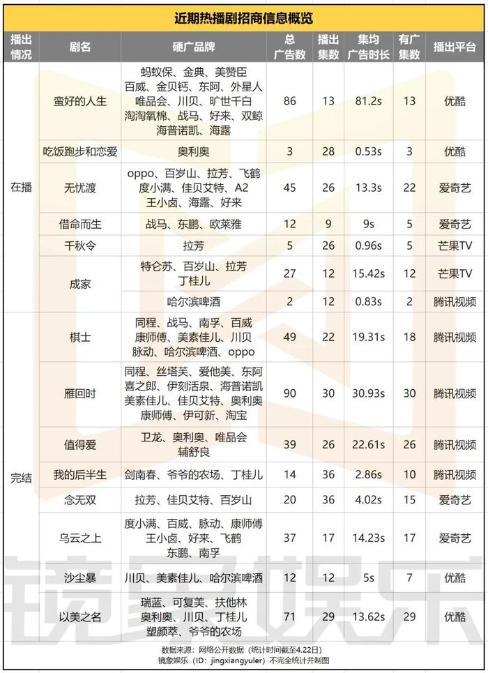 相比之下,零宣发空降的《无忧渡》开播时略显逊色,开播首日,前两集仅有OPPO的片头贴片,3-6集甚至出现无广现象。不过,随着该剧热度走高,商业合作也逐渐攀升,截至4月22日,《无忧渡》累计合作品牌已攀升至10家。
