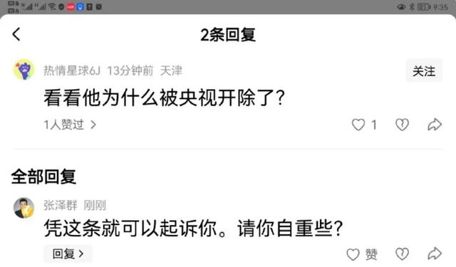 在张泽群晒出的截图中,他在一条“为什么被央视开除了”的评论下回复:凭这条就可以起诉你,请你自重些?