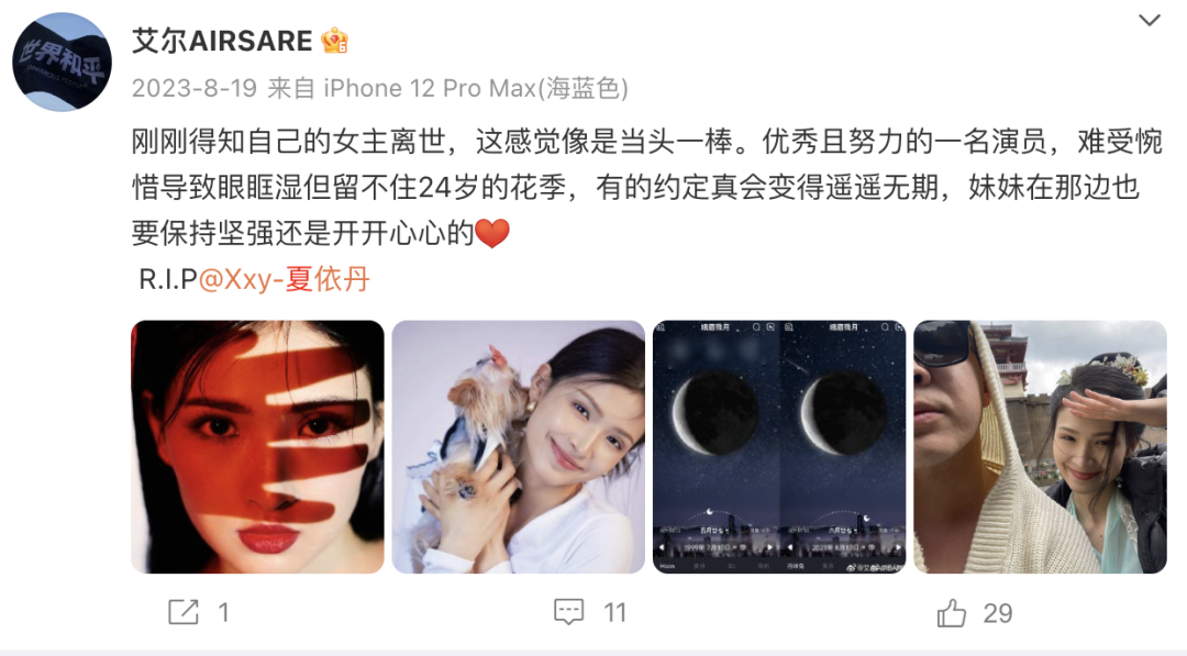 其好友@艾尔AIRSARE 曾在2023年8月发文悼念:“优秀且努力的一名演员,难受惋惜导致眼眶湿但留不住24岁的花季,有的约定真会变得遥遥无期,妹妹在那边也要保持坚强还是开开心心的。”