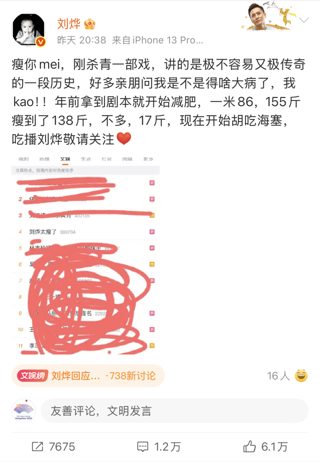 昨晚(26日),刘烨对此事做出回应:“刚杀青一部戏,讲的是极不容易又极传奇的一段历史,好多亲朋问我是不是得啥大病了!年前拿到剧本就开始减肥,一米86,155斤瘦到了138斤,不多,17斤,现在开始胡吃海塞,吃播刘烨敬请关注 。”