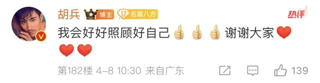 胡兵还在评论区感谢各位关心他的网友:“我会好好照顾好自己,谢谢大家。”
