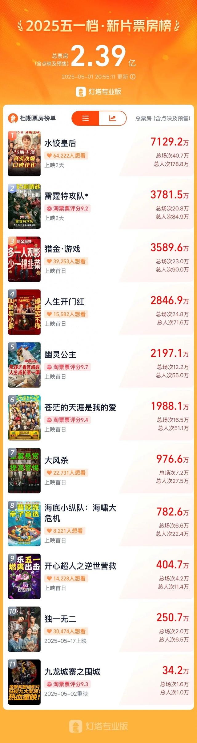 今年五一档共有11部新片集中上映,涵盖励志、喜剧、犯罪、动画等多种类型。在5月1日的单日票房榜上,由刘伟强执导、马丽主演的励志剧情片《水饺皇后》、刘德华、邱礼涛继《拆弹专家》后再度携手的《猎金·游戏》,以及宫崎骏经典动画《幽灵公主》4K修复版目前暂列前三。
