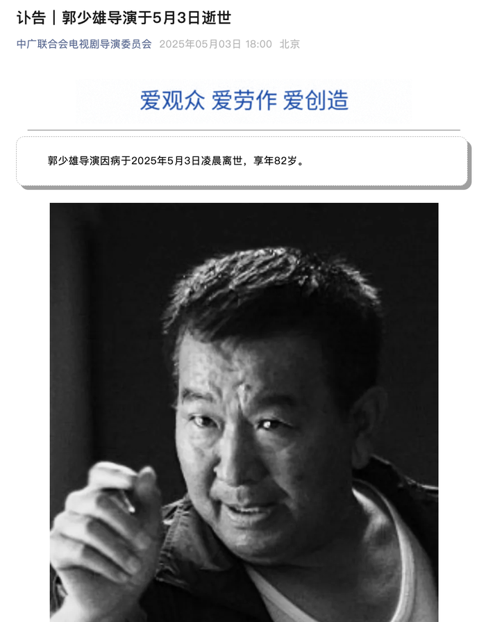 中广联合会电视剧导演委员会发布讣告,郭少雄导演因病于2025年5月3日凌晨离世,享年82岁。