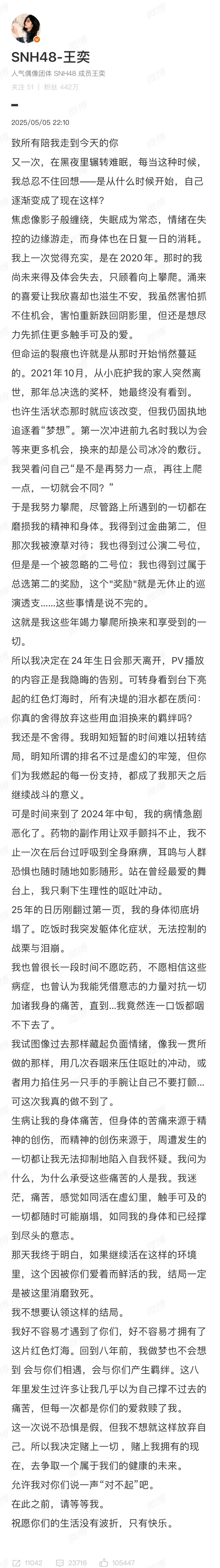 5月5日晚,女子偶像团体成员王奕发长文,向支持她的粉丝诉说一路走来的经历与内心挣扎,“但我不想就这样放弃自己。所以我决定赌上一切 ,赌上我拥有的现在,去争取一个属于我们的健康的未来。”她表示将和公司解约,接下来将要打官司。