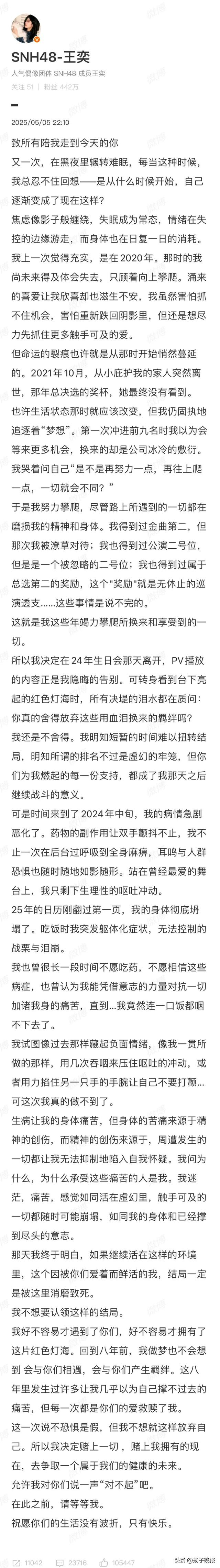 5月5日晚,女子偶像团体成员王奕发长文,向支持她的粉丝诉说一路走来的经历与内心挣扎,“但我不想就这样放弃自己。所以我决定赌上一切 ,赌上我拥有的现在,去争取一个属于我们的健康的未来。”她表示将和公司解约,接下来将要打官司。