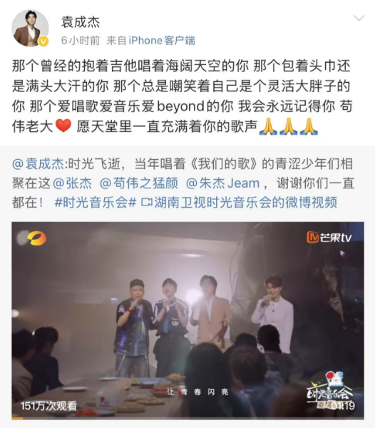 5月7日中午,张杰在社交平台发表千字长文悼念这位相识20年的老友。“很怀念那个老是会幽默大胆开玩笑,老是会被我逗得哈哈大笑,还老是会用音乐大声表达出来,在舞台上老是裹着头巾大声唱歌的~‘老大’苟伟……”