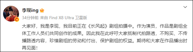 演员李现发微博呼吁抵制代拍路透: