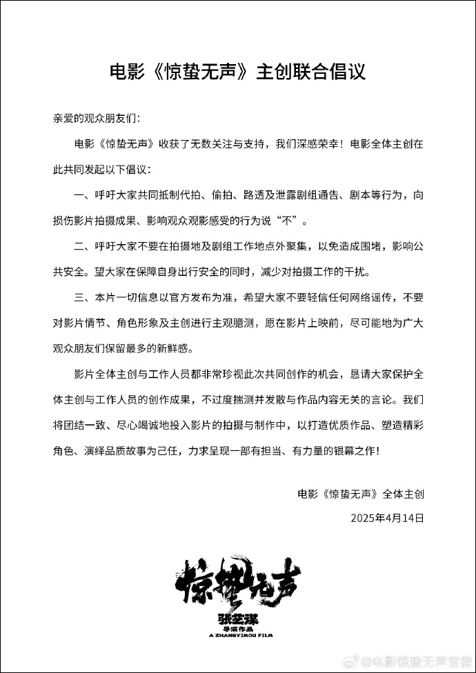 近日,张艺谋导演电影《惊蛰无声》开机,由易烊千玺、朱一龙、宋佳、雷佳音、杨幂主演,张译、刘诗诗、刘耀文特别出演。剧组主创随后集体转发一则“联合倡议”,文中写道:“呼吁大家共同抵制代拍、偷拍、路透及泄露剧组通告、剧本等行为;呼吁大家不要在拍摄地及剧组工作地点外聚集,以免造成围堵,影响公共安全。”
