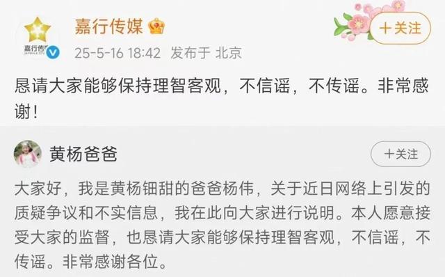 5月16日傍晚,@嘉行传媒转发黄杨钿甜的父亲的长文回应: