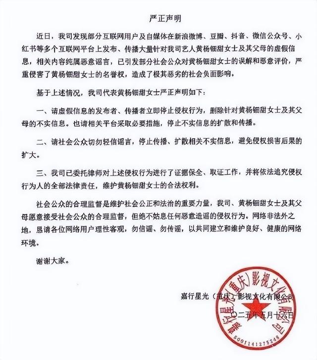 嘉行传媒、黄杨钿甜女士及其父母愿意接受社会公众的合理监督,但绝不姑息任何恶意造谣的侵权行为,恳请大家勿信谣、勿传谣。