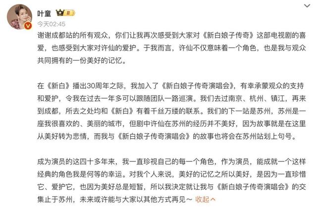 5月25日,演员叶童发文称与《新白娘子传奇演唱会》的故事将在苏州站划上句号。
