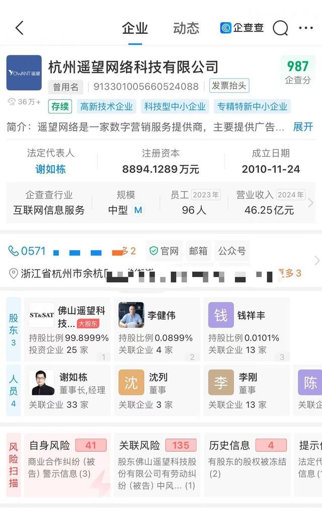 据企查查信显示,杭州遥望网络科技有限公司成立于2010年11月,注册资本8894万元,由上市公司佛山遥望科技股份有限公司持股约99%。胥渡吧文化传播(北京)有限公司成立于2015年3月,注册资本50万,创始人胥渡担任法定代表人并持股70%,该公司已登记《白蛇传30年演唱会》美术作品著作权。