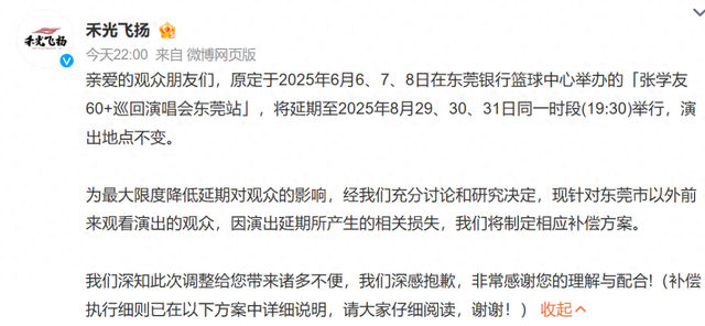 因演唱会日期与高考时间重合,27日晚,“张学友60+巡回演唱会东莞站”主办方广州禾光飞扬文化传媒有限公司官方微博发布通告致歉,并公布相关处理方案: