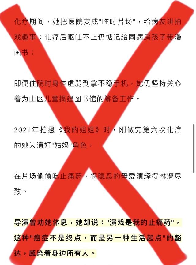 记者采访中国国家话剧院知情人士得知,这条广为流传的“朱媛媛遗嘱”内容纯属捏造,对其病症情况的描述也严重失实。诸如“给丈夫的最后一封信”“给女儿的遗嘱”“把骨灰撒到拍摄地大海”“捐赠眼角膜”“捐出所有遗产”“捐表演笔记”等内容,也皆属臆想编造。还有些公号中提到“朱媛媛在剧组晕倒后确诊卵巢癌三期”,也属于不实传言。
