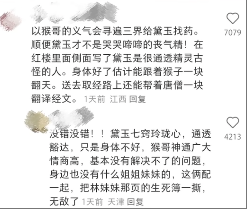 近些年,短视频和社交媒体上流传着一种调侃,“年轻时不能遇见太惊艳的猴”,网友给孙悟空贴上“理想型伴侣”“完美男友”的标签。除了希望孙悟空成为自己男友外,网友们还进行了拉郎配,为他找了一位女友,不是别人,正是《红楼梦》里的林黛玉。近些年来流传在短视频上的“圣黛cp”剪辑片段中,有这样的片段,黛玉即将离世,活不过第二天,孙悟空为此怒闯阎罗殿,在生死簿划掉林黛玉的名字。黛玉恢复如初,道:“我今儿好多了,我想出去逛逛。”悟空回应,“你难得来我这花果山,就看看我这山上的景致如何?”网友评论,“好嗑!”