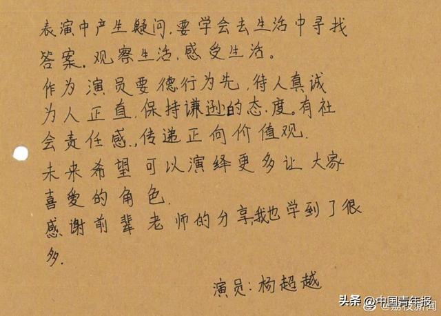 杨超越写道 :“表演中产生的疑问,要学会去生活中寻找答案。观察生活、感受生活。”