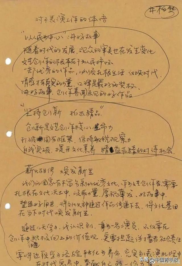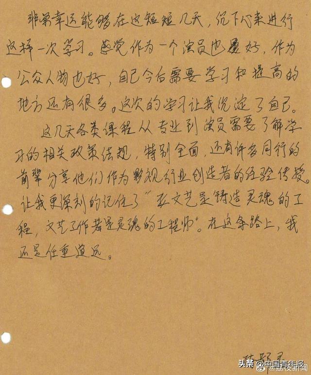 陈都灵、杨超越、范丞丞、白宇、井柏然、朱亚文、白客、春夏等演员参加了本次培训班,并分享了手写的心得体会。