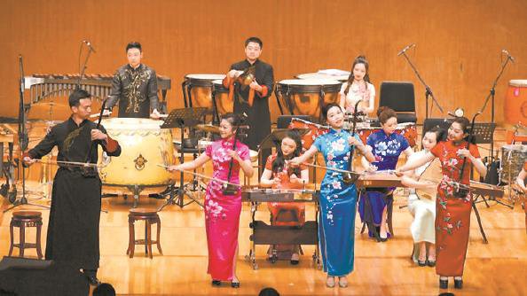 若不是从第二个节目《铮铮》起,乐风突转为青春时尚,大约上海观众还会误以为中央民族乐团参加“时代交响”的《宝藏国乐——国乐正青春》走的仅仅是传统节日风。身着各色旗袍的女乐手,与身着黑色为主基调的长衫的男演奏员,在东艺的舞台上板正地演绎《四海欢腾》时,仿佛让夏日的观众回味起新春佳节……