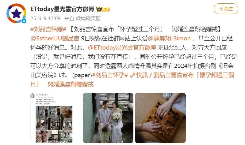 双喜临门!女星刘品言官宣与男演员连晨翔结婚,并已怀孕。