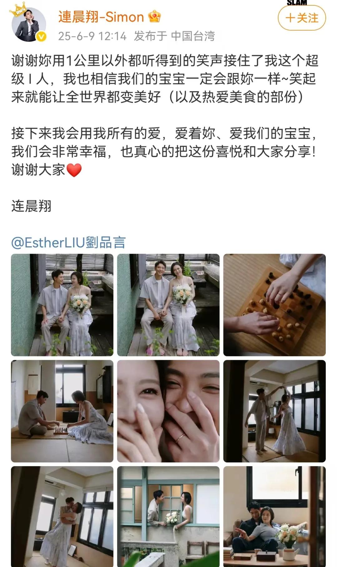 6月9日中午,刘品言在个人社交平台晒了多张甜蜜照,并配文:谢谢连晨翔,谢谢我们的小孩,谢谢世界赠与我的平凡与不平凡。请用守护的心祝福我们。