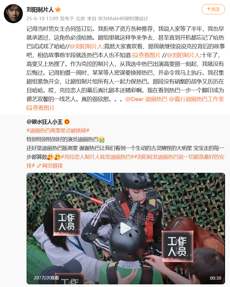 6月10日凌晨,《克拉恋人》制片人之一的刘阳发文称,看到“高雯”(迪丽热巴 饰)上热搜,那段没有硝烟的“战争”又清晰浮现。按照刘阳的说法,在开拍一周时,有人要求换掉迪丽热巴,并命令他马上执行。刘阳召集剧组紧急开会,让众人一起力保迪丽热巴:“《克拉恋人》的幕后真比剧本还精彩啊……”