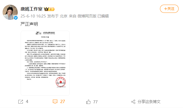 10日下午,@唐嫣工作室发布律师声明回应: