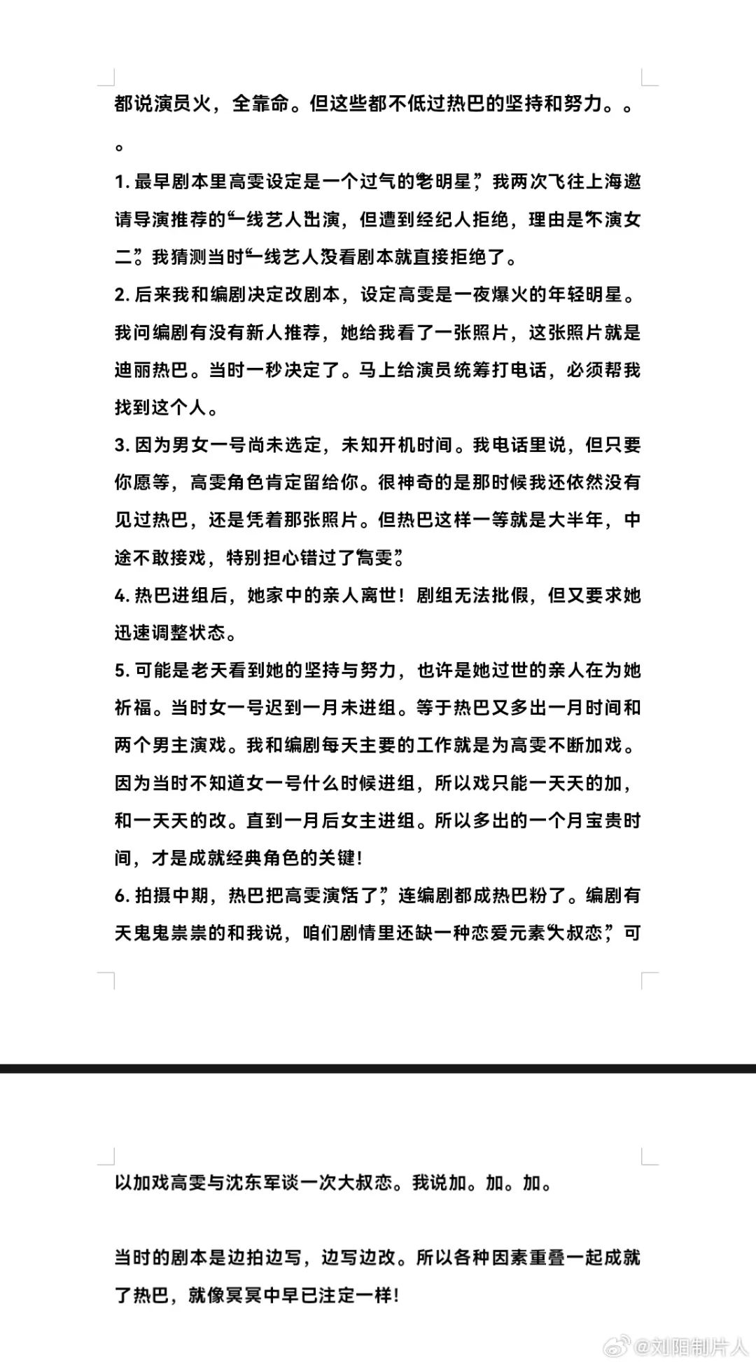 他还称女一号迟到一个月未进组,在不知道女一号什么时候进组的情况下,不断给迪丽热巴饰演的高雯加戏。