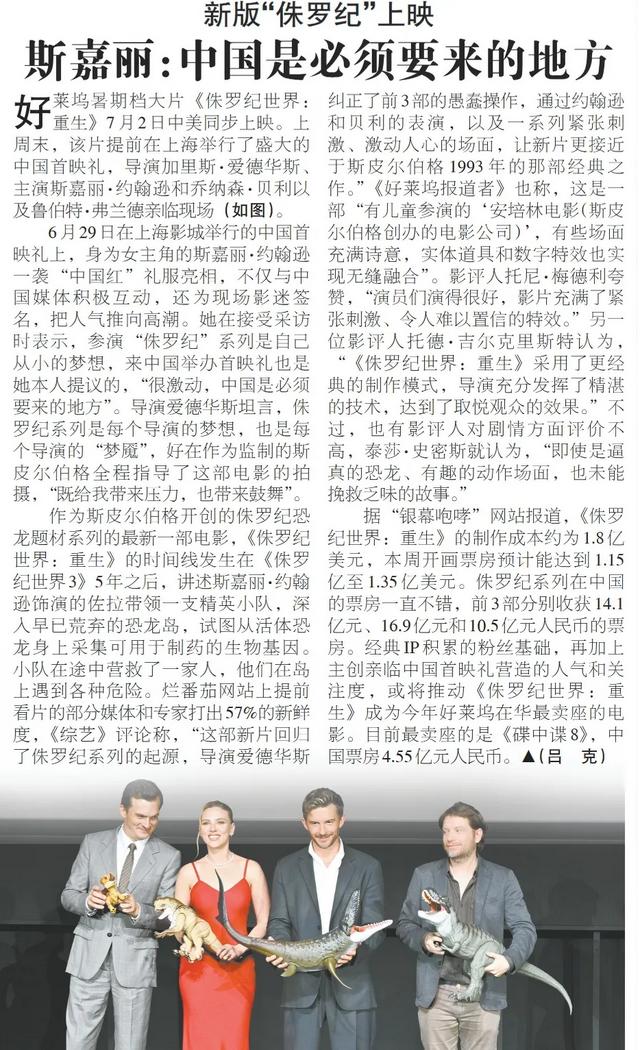 电影《侏罗纪世界:重生》上海首映礼6月29日在上海影城举行的中国首映礼上,身为女主角的斯嘉丽·约翰逊一袭“中国红”礼服亮相,不仅与中国媒体积极互动,还为现场影迷签名,把人气推向高潮。她在接受采访时表示,参演“侏罗纪”系列是自己从小的梦想,来中国举办首映礼也是她本人提议的,“很激动,中国是必须要来的地方”。导演爱德华斯坦言,侏罗纪系列是每个导演的梦想,也是每个导演的“梦魇”,好在作为监制的斯皮尔伯格全程指导了这部电影的拍摄,“既给我带来压力,也带来鼓舞”。