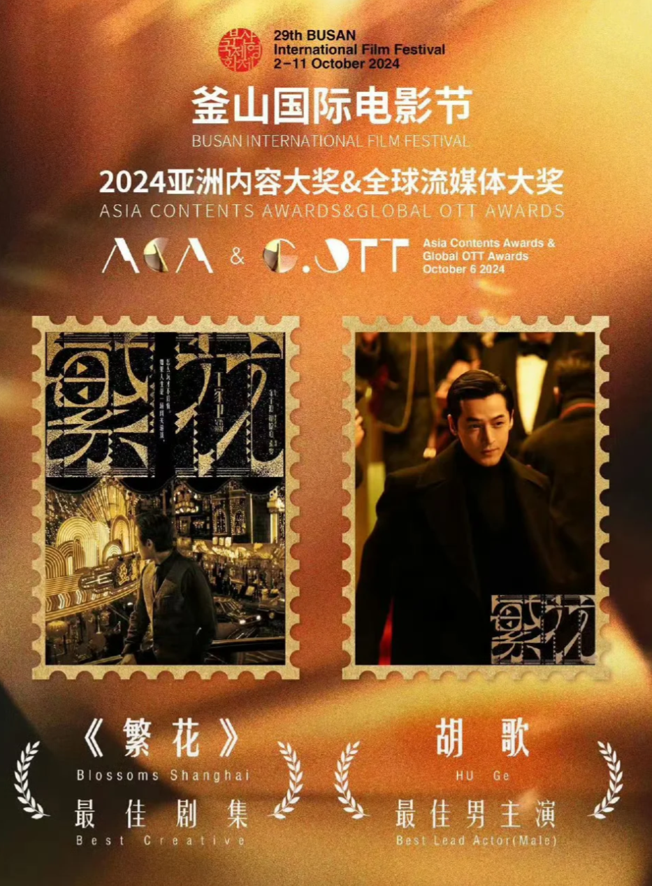 新闻稿里特别提到了2024年10月,第29届釜山国际电影节亚洲内容大奖和全球流媒体大奖颁奖典礼上,《繁花》荣获最佳剧集奖项,胡歌凭借在剧中的优秀表现夺得最佳男主角奖。