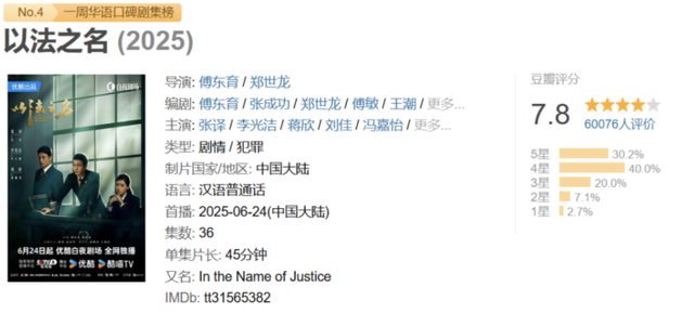 截至目前,《以法之名》在豆瓣评分为7.8分,6万人打分,并入选了豆瓣“一周华语口碑剧集榜”。