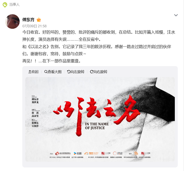 收官当晚,该剧导演傅东育发文:“今日收官。好的坏的,赞誉的、批评的痛斥的都收到,在总结。比如开篇入戏慢,注水抻长度,演员选择有失误………全在反省中。和《以法之名》告别。它记录了我三年的跋涉历程。感谢一路走过路过并肩过的伙伴们。谢谢包容,宽待,鼓励与点拨~再见!在下一部作品里重逢。”