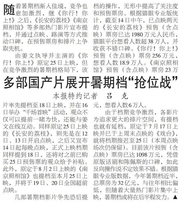 随着暑期档渐入佳境,竞争也愈加激烈,继《你行!你上!》之后,《长安的荔枝》《南京照相馆》等多部热门影片宣布提档,并通过点映、路演等方式推动口碑,在预售票房和排片上争取先机。