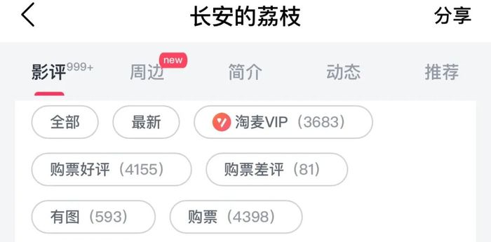 再来看豆瓣和淘票票,13日,豆瓣上的电影票房组开贴对《长安的荔枝》进行打分,截止17日评分人数超580人,四五星评分合计占比45%,33%的人投了吃瓜选项,二星及以下评分占比仅为9%。同样截止17日,淘票票上《长安的荔枝》购票好评人数为4155人,差评为81人,好评与差评比为51:1。