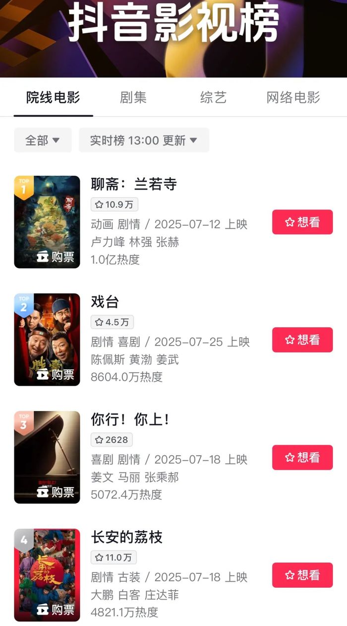 从抖音电影榜7月17日下午13时更新的数据来看,《长安的荔枝》的实时热度位居榜单第四,排在上映首周的《聊斋:兰若寺》和待映的《戏台》《你行!你上!》之后,但从抖音新片想看人数来看,《长安的荔枝》以11万的想看领先上述三部影片。
