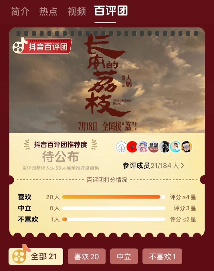 当抖音电影评分成为观影群体决策的又一大风向标后,外界也可以通过抖音上点映观众的打分对《长安的荔枝》质量有一个大致预估,近两日,《长安的荔枝》在抖音出炉的新评分几乎都是四星及以上。此外,抖音汇集百余名影评人的百评团中,已有21人对《长安的荔枝》进行打分,其中“喜欢”也就是认为影片评分在四星及以上的为20人。