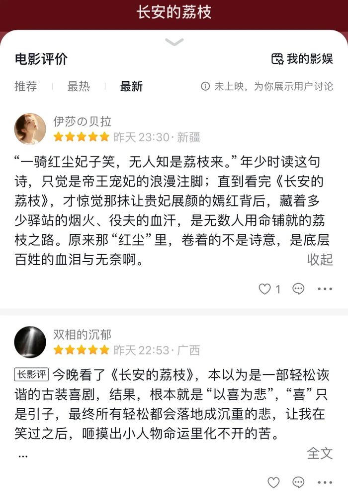 不过,点映阶段也有部分影评人认为《长安的荔枝》不够优秀,原因在于影片所表达的“兴,百姓苦;亡,百姓苦”的内核思想,在古代的历史长河中已经被文人墨客反复书写,新意欠缺。