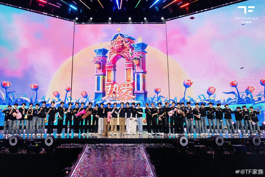 TF家族2025年新年音乐会大合照(台上分别是二代时代少年团、三代登陆少年团和厂牌TF_ING,以及四代和部分五代练习生) 图源:TF家族官博