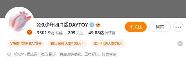 7月18日,演员、歌手肖战微博账号从原名称“X玖少年团肖战DAYTOY”变更为“肖战”,实现个人账号标识的彻底独立。目前该昵称已生效,原ID关联信息全部迁移至新账号。